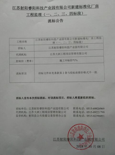 江苏射阳睿阳科技产业园有限公司新建标准化厂房(一、二、三、四标段)工程监理流标公告