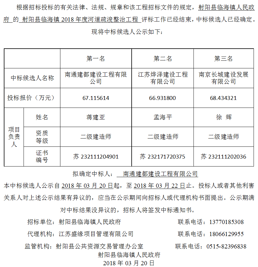 射阳县临海镇2018年度河道疏浚整治工程中标候选人公示