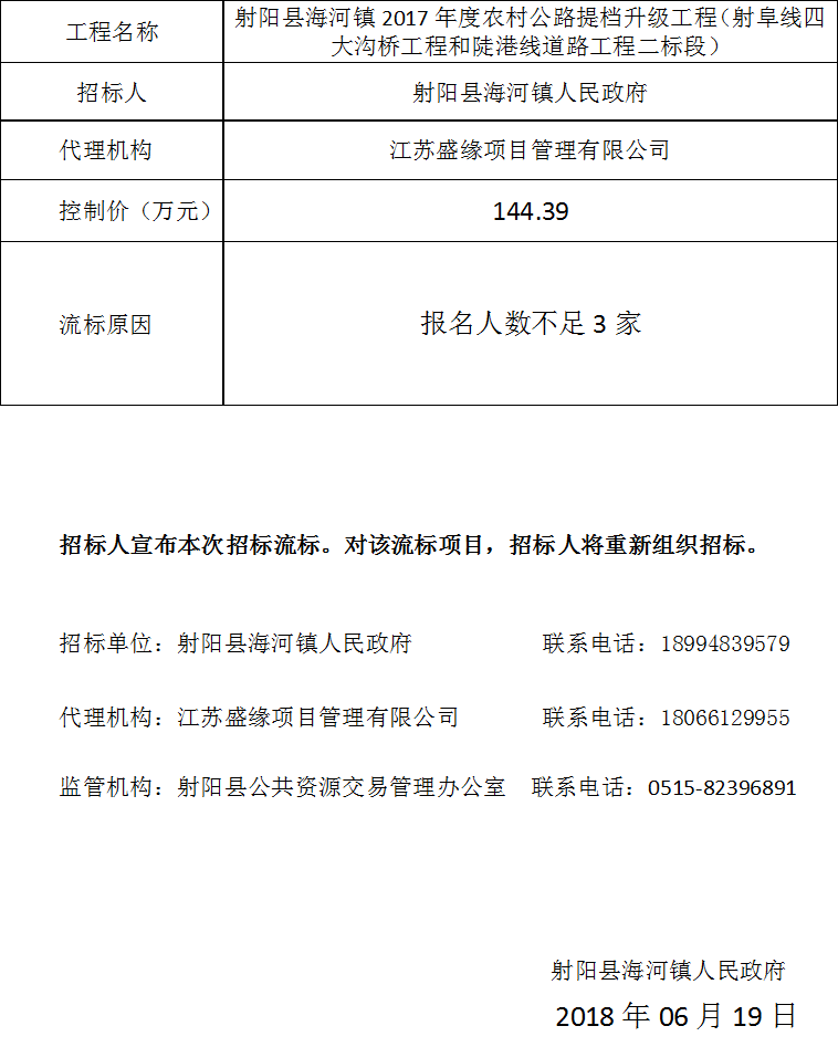 射阳县海河镇2017年度农村公路提档升级工程(射阜线四大沟桥工程和陡港线道路工程二标段)流标公告