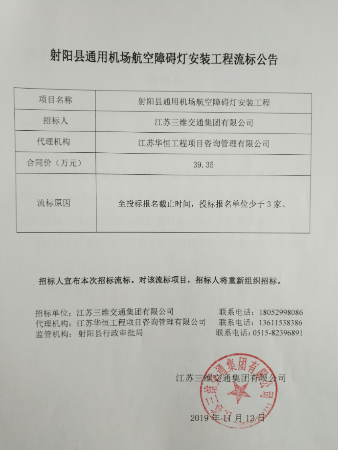 射阳县通用机场航空障碍灯安装工程流标公告