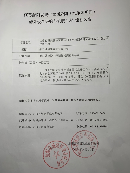 江苏射阳安徒生童话乐园(水乐园项目)游乐设备采购与安装工程流标公告