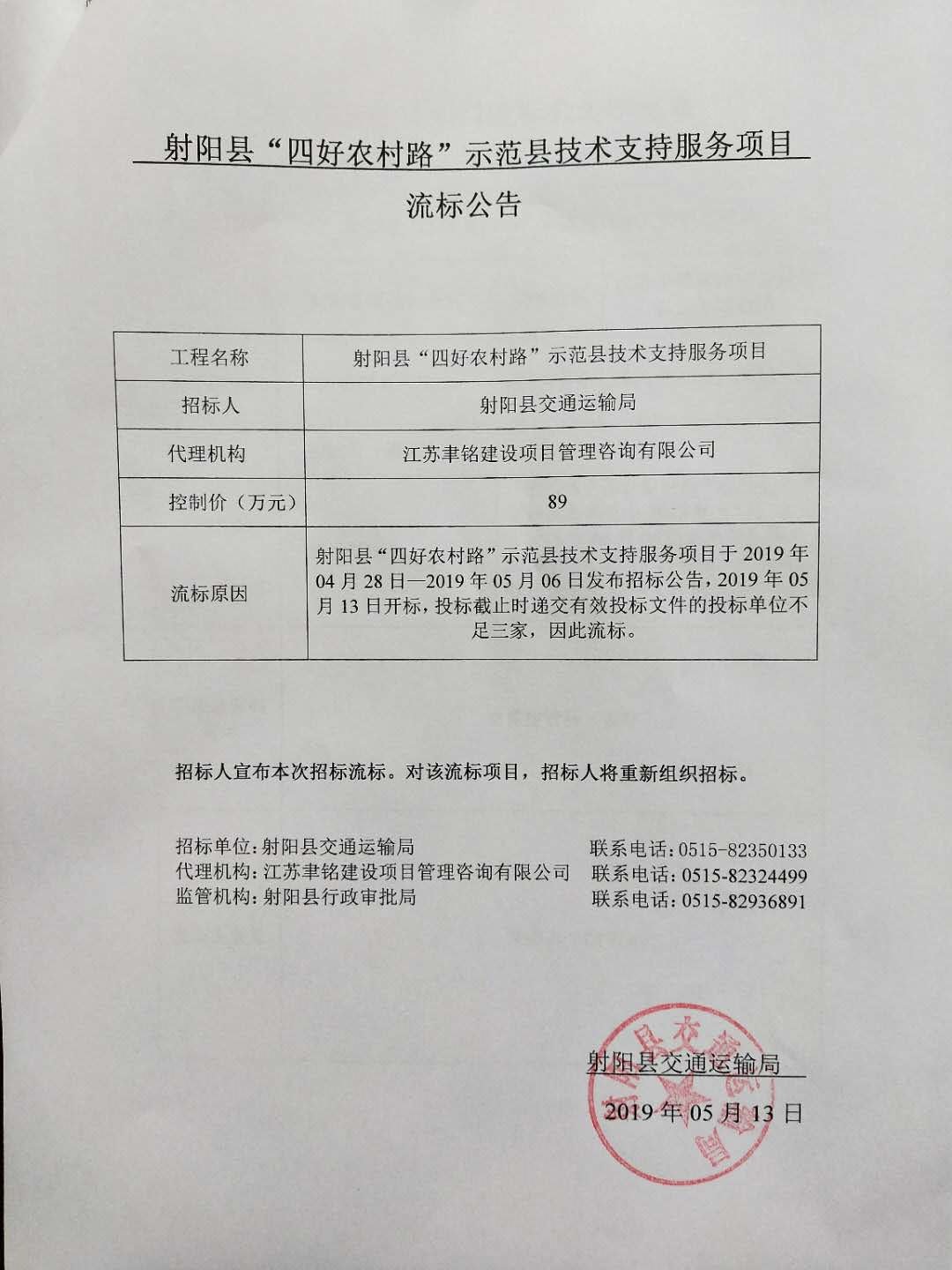射阳县“四好农村路”示范县技术支持服务项目流标公告