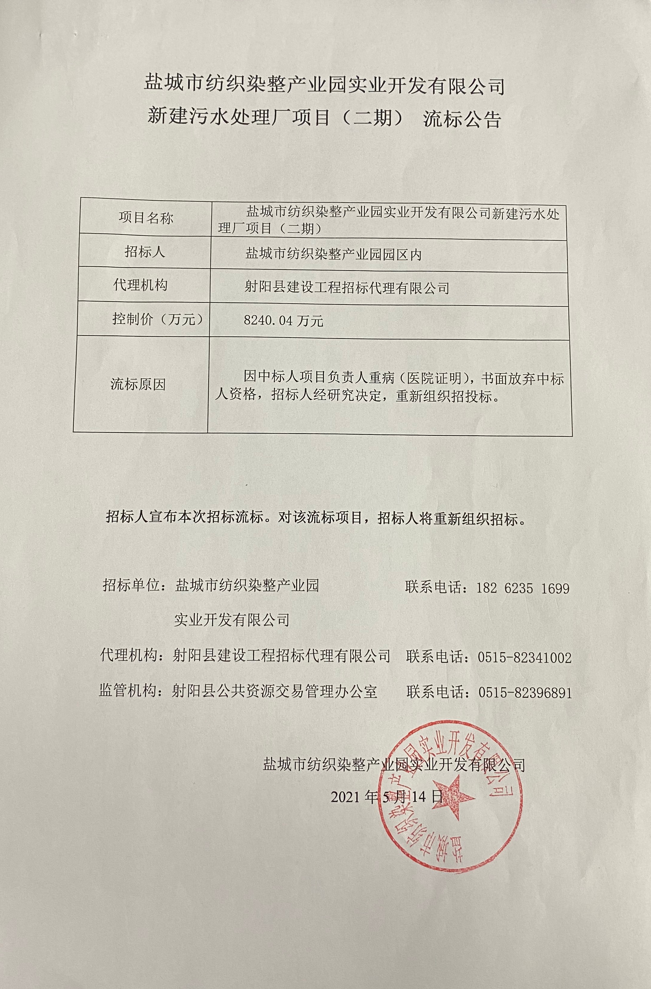 盐城市纺织染整产业园实业开发有限公司新建污水处理厂项目(二期)流标公告