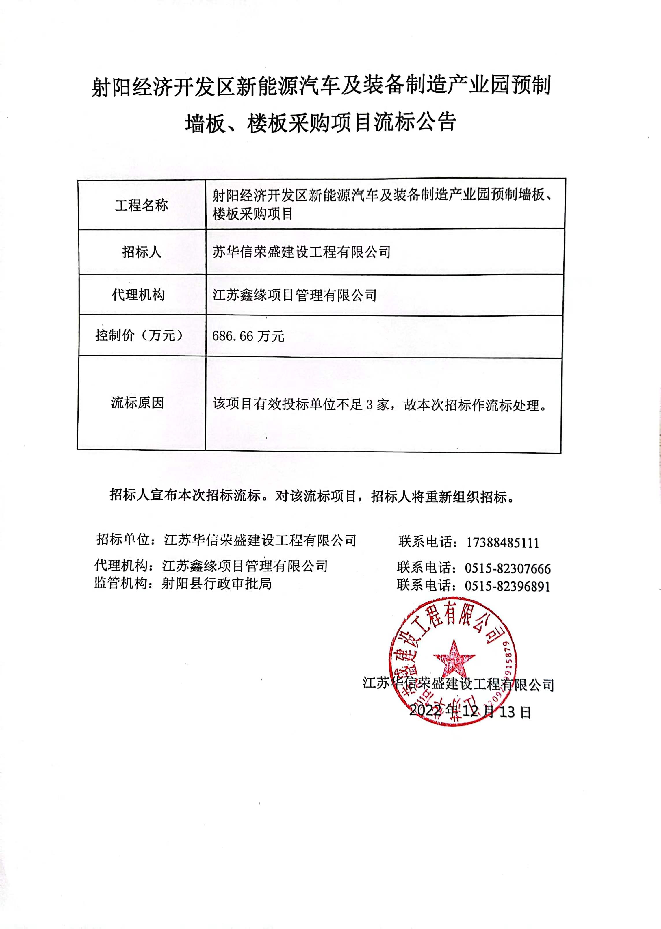 射阳经济开发区新能源汽车及装备制造产业园门预制墙板、楼板采购项目流标公告