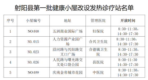 为进一步优化疫情防控措施,为发热患者提供便利的就医购药途径,我县将部分健康小屋改设发热诊疗站。现将第一批发热诊疗站公告如下: