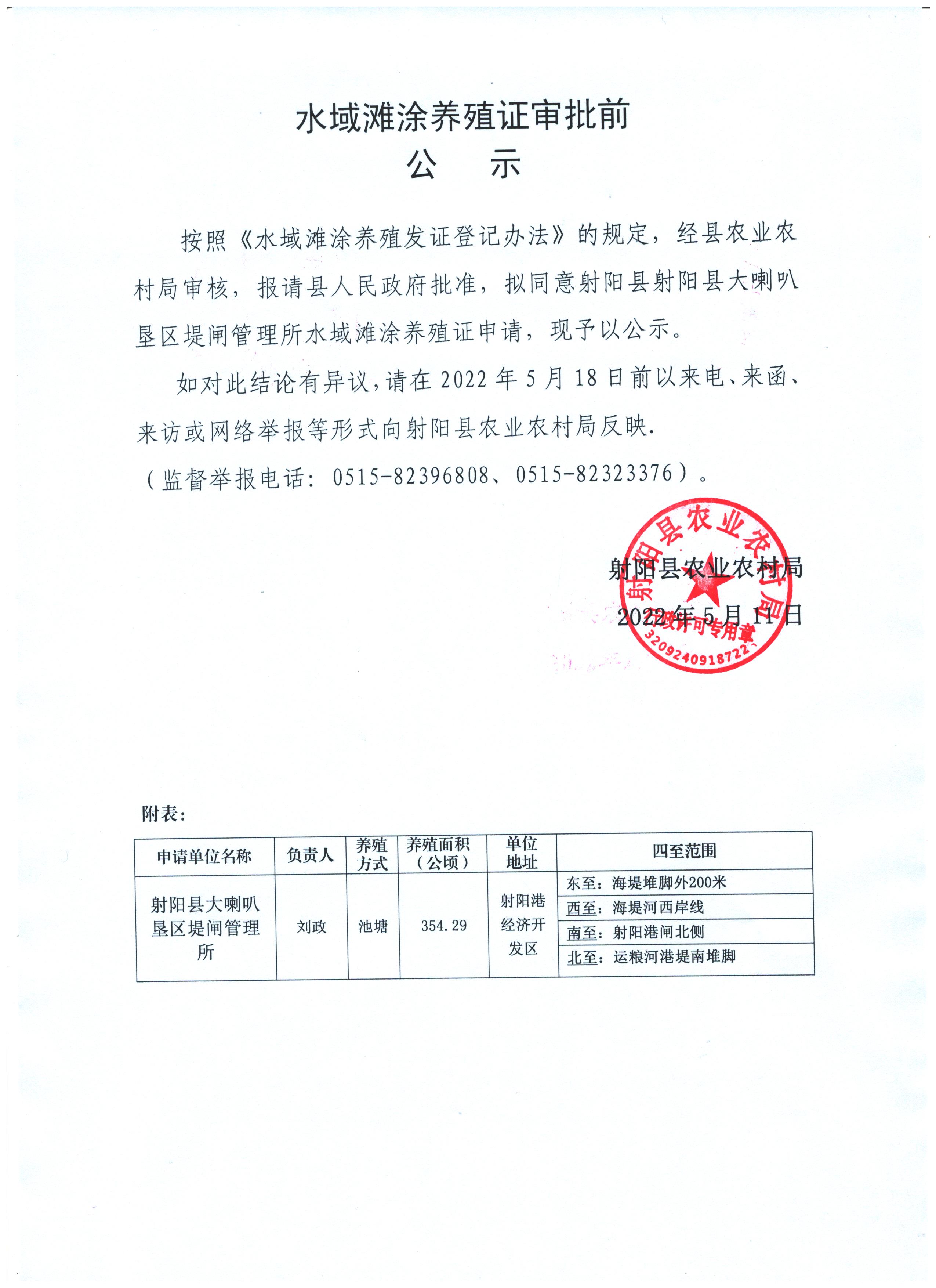 按照《水域滩涂养殖发证登记办法》的规定,经县农业农村局审核,报请县人民政府批准,拟同意射阳县射阳县大喇叭垦区堤闸管理所水域滩涂养殖证申请,现予以公示。