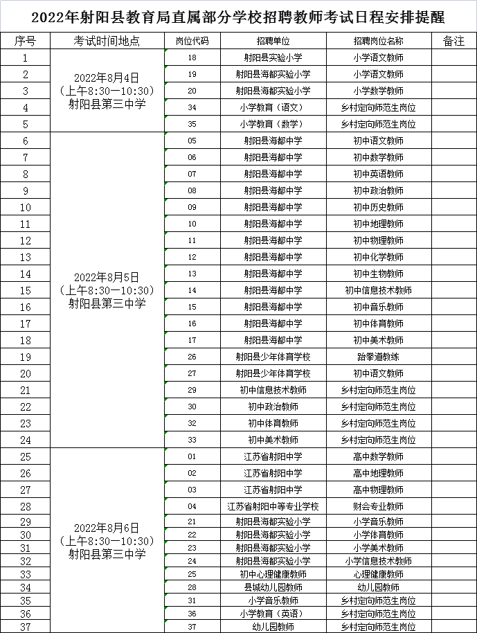 欢迎你们报考2022年射阳县教育局直属部分学校招聘教师相关岗位,在笔试开考前,有几点温馨提醒,希望你能认真阅读,以免影响你正常应考。1、根据《2022年射阳县教育局直属部分学校招聘教师公告》(以下简称《公告》)精神,考生领取准考证的地点不变,仍在射阳县第三中学,领取时间提前至上午7:30,截止时间仍是下午6:00,为了给各位考生提供方便,中午不休息,正常领取准考证;届时请大家凭有效证件(《公告》中要求为居民身份证)到指定窗口缴费后领取本人的准考证。2、根据报名及资格初审情况,对相关学科笔试的时间、地点提前予以提醒告知,以便你合理规划行程。拿到准考证后,请仔细核对考试时间、地点和报考岗位,如有误差,请立即与现场工作人员联系。3、请各位考生严格按照疫情防控要求做好个人防护和健康管理,考试当天要确保你的“苏康码”为绿码,现场测量体温低于37.3℃,且无干咳等异常症状的,方可进入考试现场,考试全程需佩戴口罩。