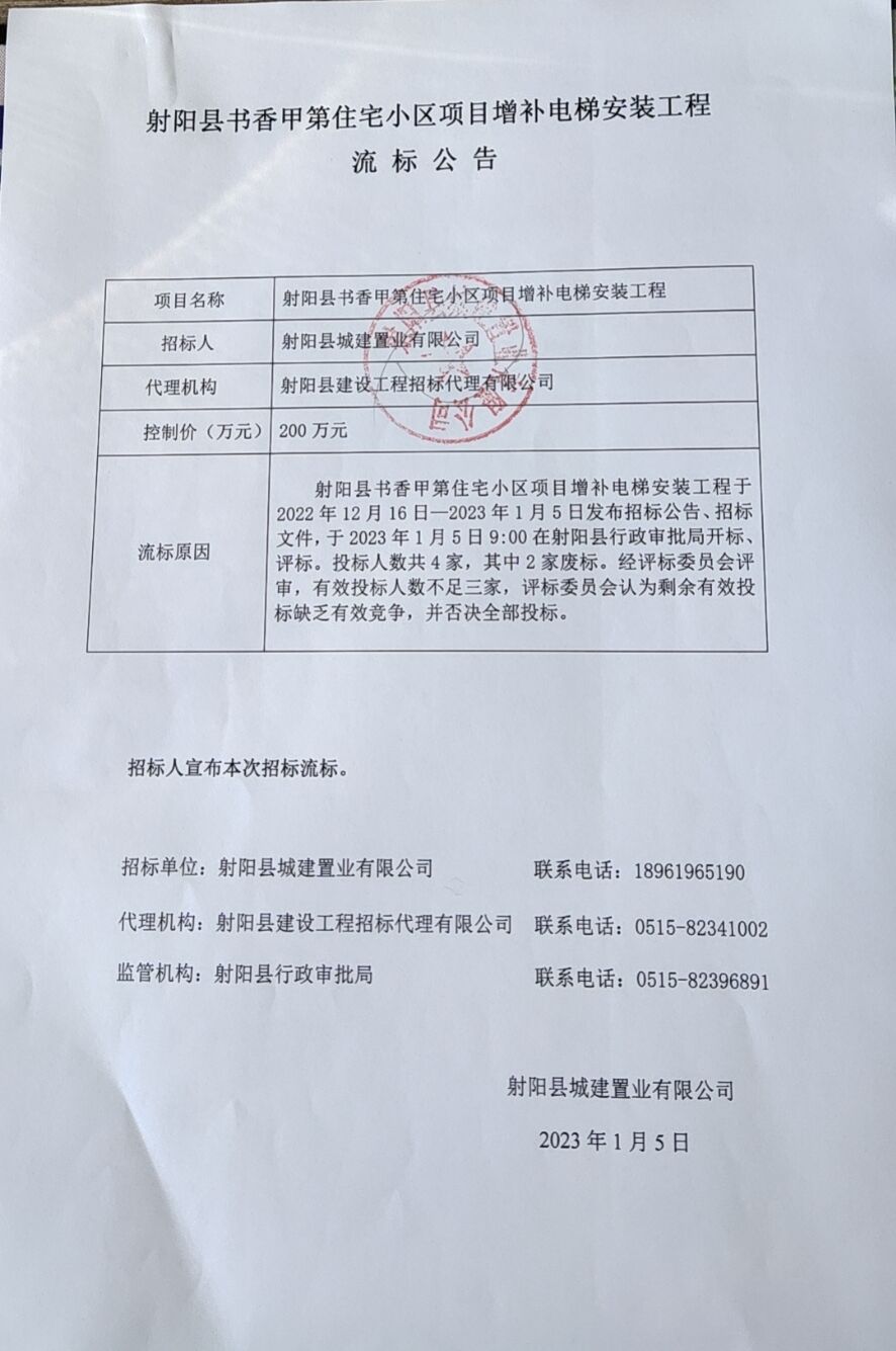 射阳县书香甲第住宅小区项目增补电梯安装工程流标公告