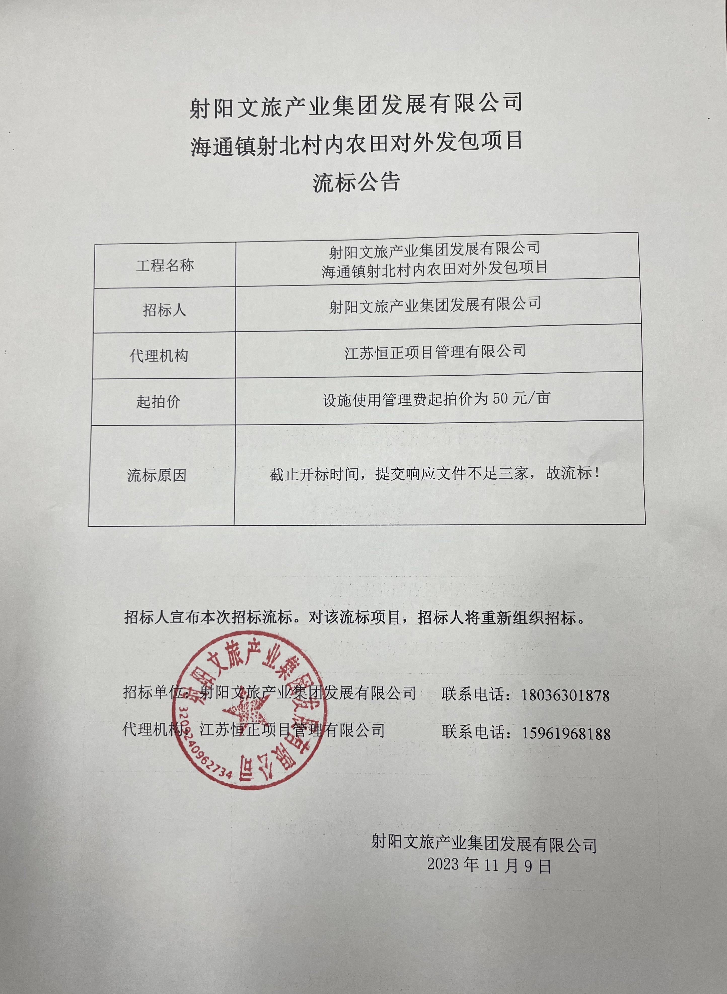 射阳文旅产业集团发展有限公司海通镇射北村内农田对外发包项目 流标公告