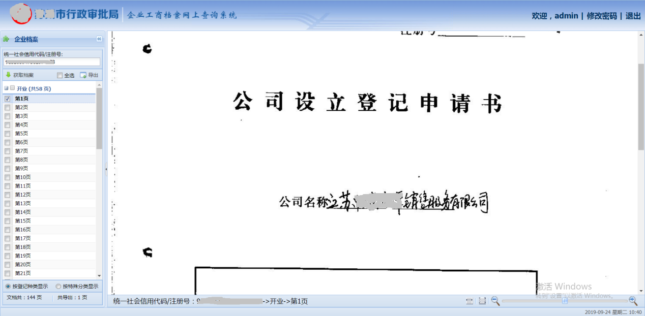 3 档案内容页右下方会显示一个二维码,可以在无需登录的情况下,在五天内用手机扫描此二维码可显示此页文档,五天后此二维码将失效。档案内容去的下方会显示企业的统一社会信用码/注册号以及当前页面的编号,右边的按钮和滑块可以调整档案的显示大小以方便浏览。