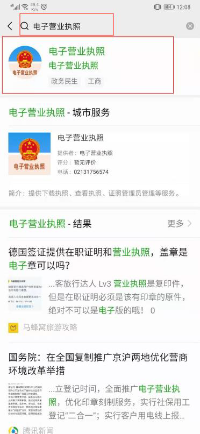 3) 在“小程序”里搜索中输入“电子营业执照”即可以查询出“电子营业执照”