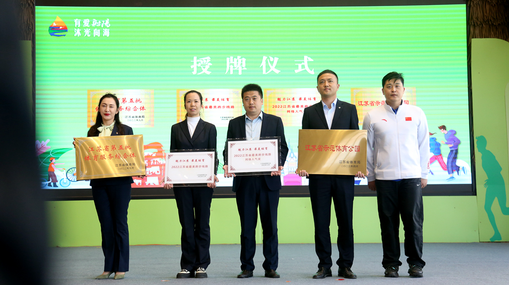 体育,彰显一个城市的活力,体现一个城市的张力,反映一个城市的经济发展水平与社会和谐进程。近年来,我县以创建国家级体育产业示范基地为追求,积极开发“体育+旅游”“体育+养生”“体育+文化”“体育+农业”等新业态,取得了令人瞩目的成绩,射阳城建体育服务综合体被命名为“江苏省第五批体育服务综合体”,射阳日月岛康养旅游度假区被评为江苏省“最美跑步线路”和“网络人气奖”,射阳后羿体育公园被命名为“江苏省示范体育公园”,活动中,张腾为获奖单位进行颁奖。