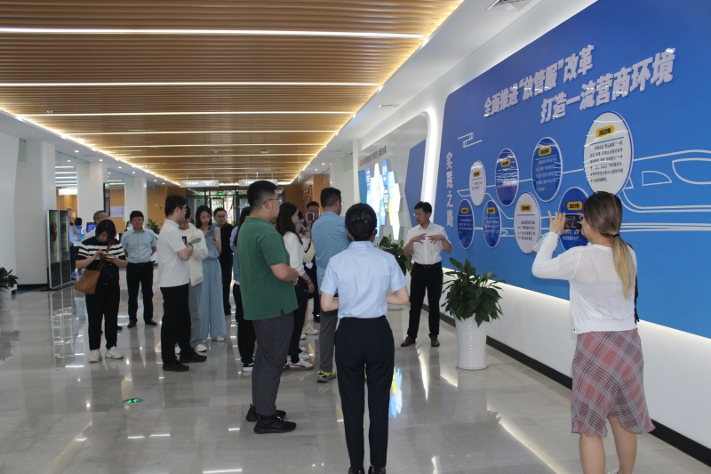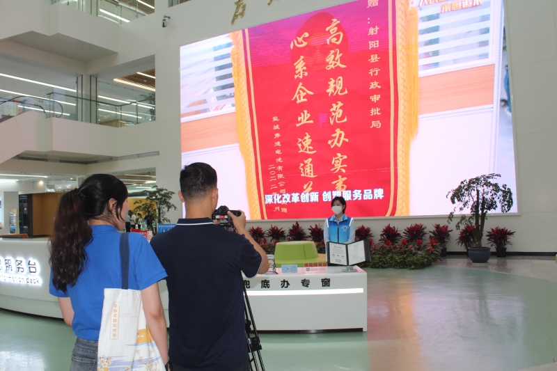 在6月13日,参加全省高质量发展调研的人民网、新华社、中央广电总台、光明日报、中新社等近20家省内中外媒体的30多名中外记者,齐聚射阳县行政审批局政务服务大厅,现场感受这个“国”字号先进单位的创新举措和温馨服务。在环境整洁,灯火通明的服务大厅,射阳县行政审批局局长陈健既当引导员,又当解说员,引领记者们观摩市民中心精心打造的人社、医保、不动产、公安、税务、企业开办、工程建设、综合审批、中介等 12 大服务专区,并就记者关注的项目审批九证联发、红色代办、拿地即开工等重大创新举措作了深入细致的解读,这些主题服务更集中、单项服务更精准、为民办事更高效的创新做法,给记者留下了深刻印象;所到大厅区域,中外记者忙采点、忙提问、忙取景,不亦乐乎,耀眼的闪光灯和录音、录像设备,记录下射阳县行政审批局的高光时刻,在省内各级新闻媒体上密集高效地留下了射阳“放管服”改革的骄人印记。