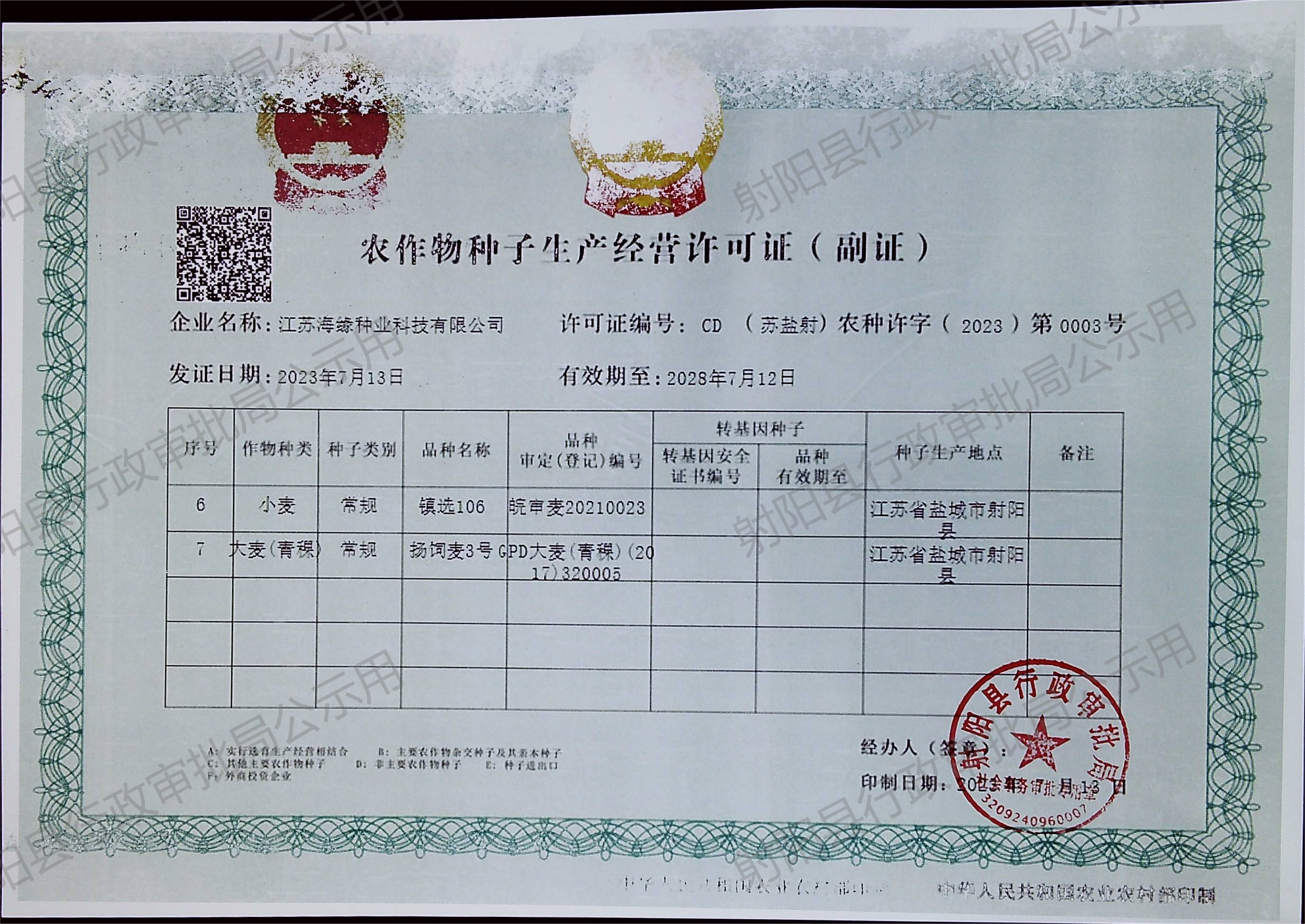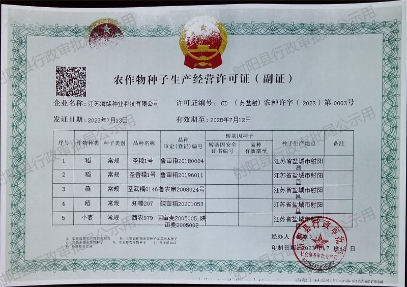 农作物种子生产经营许可证公示