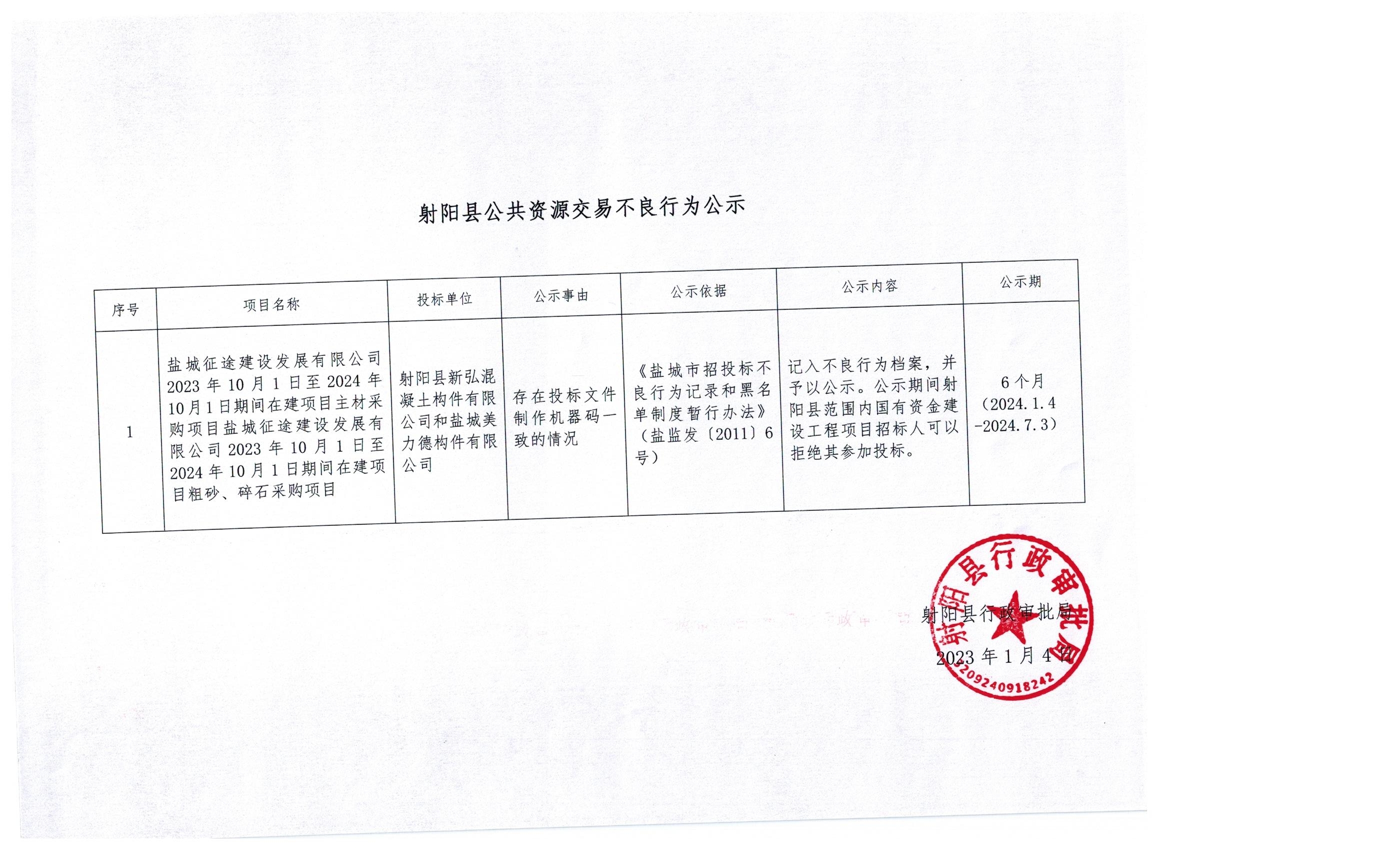射阳县新弘混凝土构件有限公司、盐城美力德构件有限公司不良行为公示
