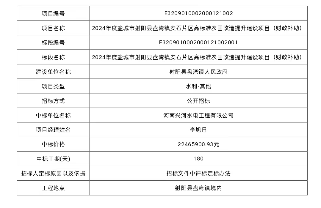 2024年度盐城市射阳县盘湾镇安石片区高标准农田改造提升建设项目(财政补助)中标结果公告