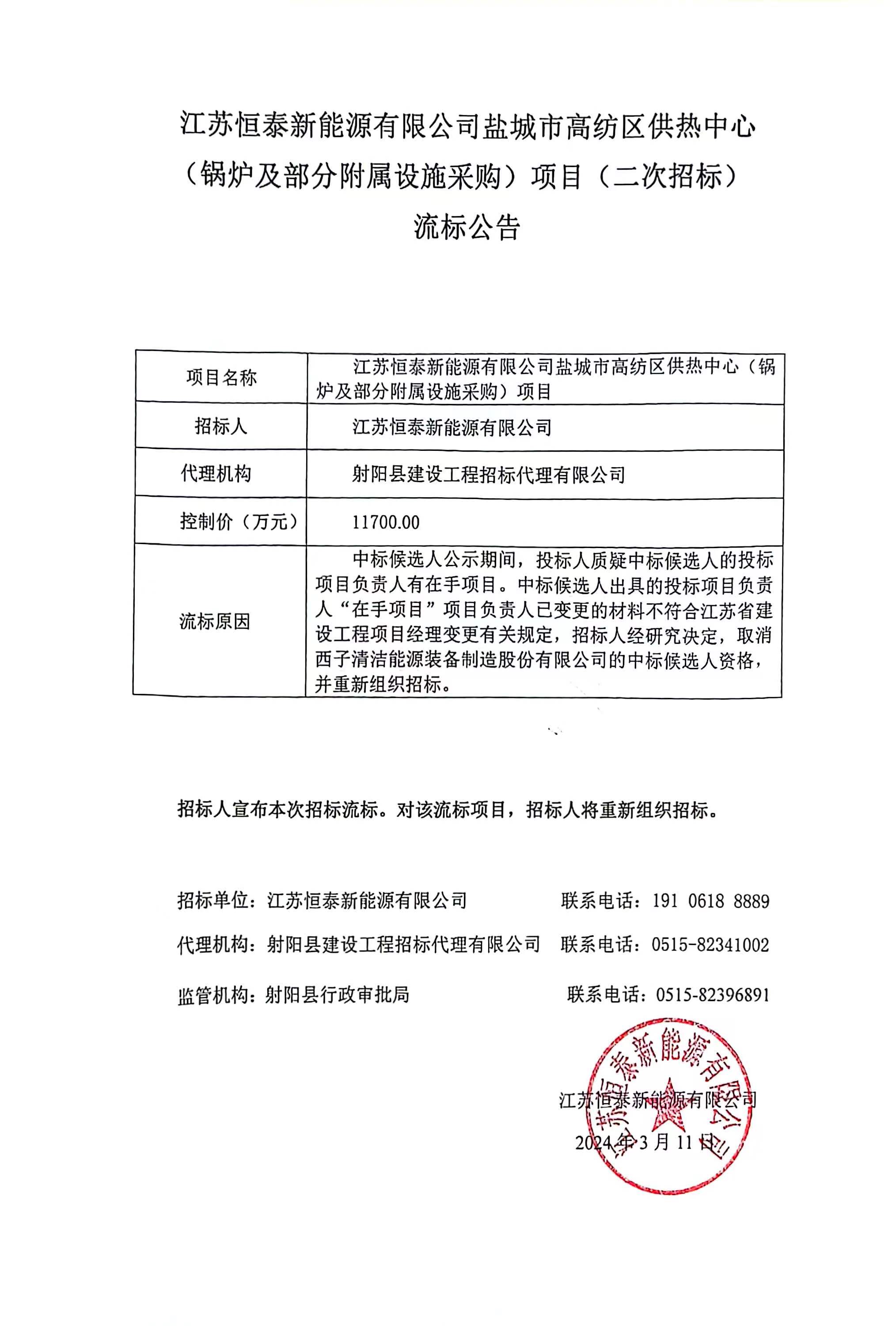 江苏恒泰新能源有限公司盐城市高纺区供热中心(锅炉及部分附属设施采购)项目(二次招标) 流标公告