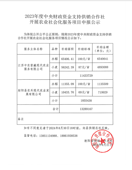 2023年度中央财政资金支持供销合作社开展农业社会化服务项目申报公示