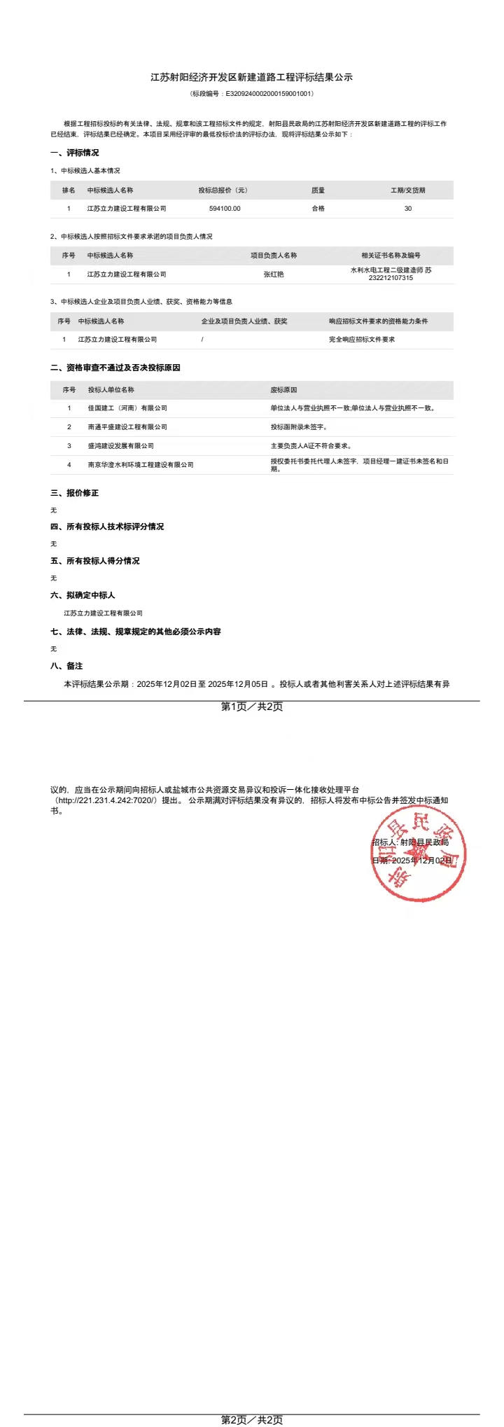 江苏射阳经济开发区新建道路工程评标结果公示