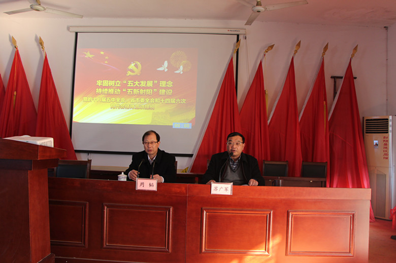 会上,镇党委书记苏广军要求全体与会人员提高思想认识,全面掀起学习党的十八届五中全会、省市委全会和县党代会精神的热潮,把握精神实质,坚持用十八届五中全会、省市委全会和县党代会精神指导实践、推动工作,努力实现“十三五”良好开局。