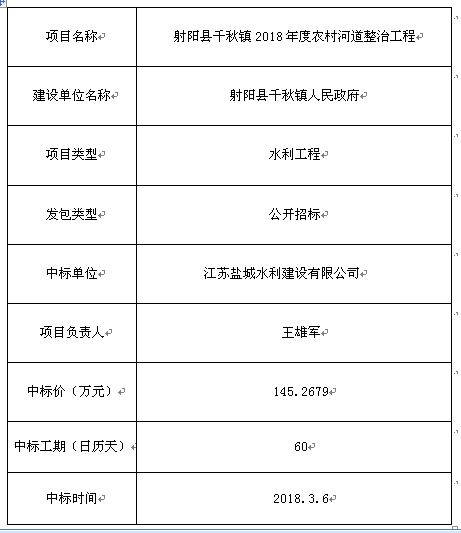 射阳县千秋镇2018年度农村河道整治工程中标公告