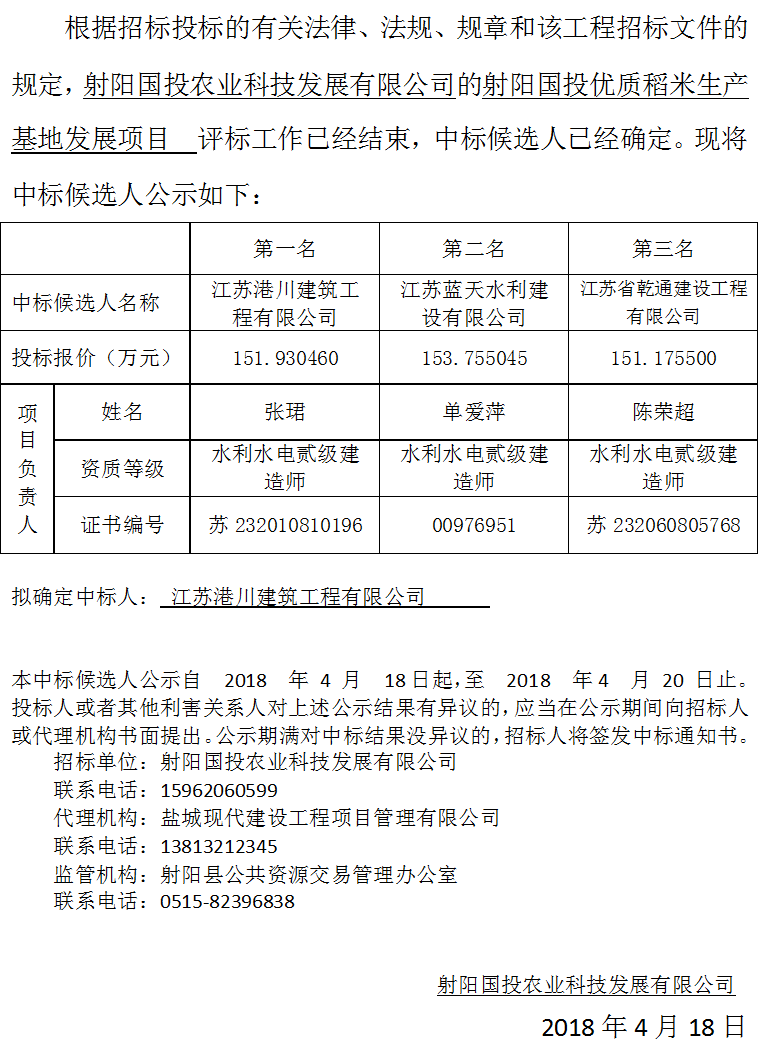 射阳国投优质稻米生产基地发展项目中标候选人公示