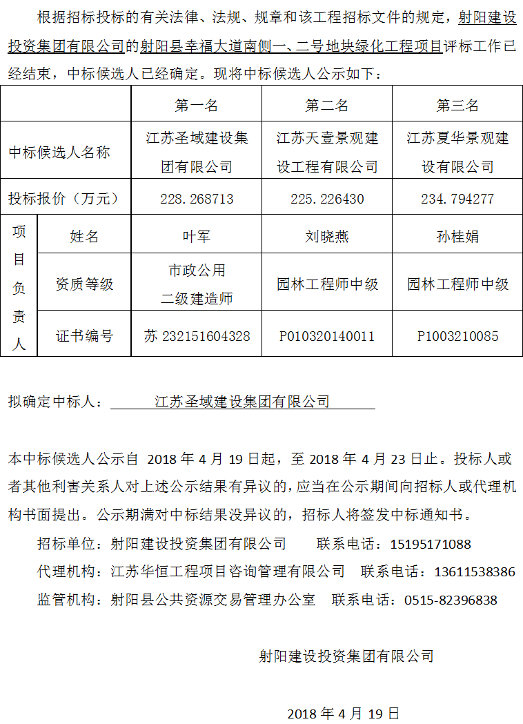 射阳县幸福大道南侧一、二号地块绿化工程项目中标候选人公示