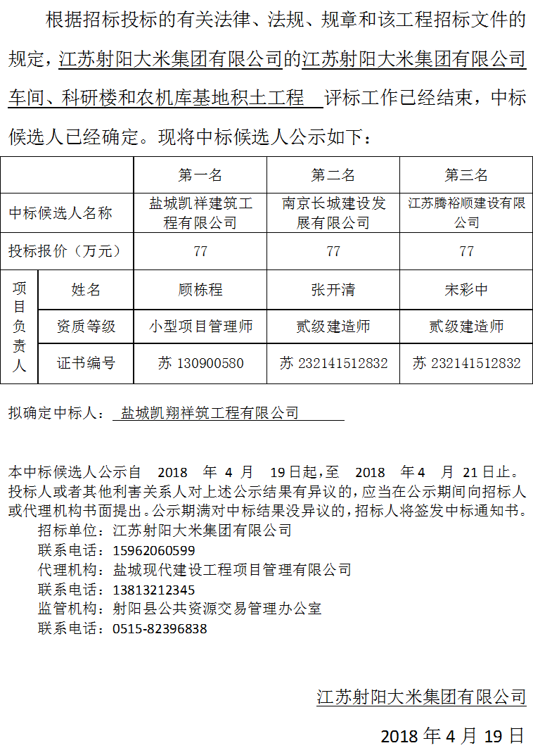 江苏射阳大米集团有限公司车间、科研楼和农机库基地积土工程中标候选人公示