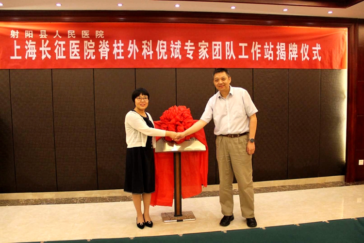 副县长戴翠芳,上海长征医院脊柱外科学科带头人、骨科医院副院长倪斌共同为工作站揭牌