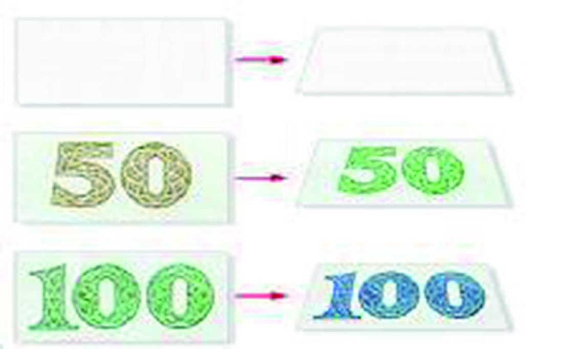 我们将纸币的票面置于与视线垂直的位置,观察票面正面左下方的面额数字,此时100元券面额数字的颜色是绿色,50元券面额数字的颜色是金黄色;然后我们将票面慢慢地倾斜,当票面倾斜到一定角度时,100元券面额数字的颜色变成了蓝色,而50元券面额数字的颜色则变为绿色。