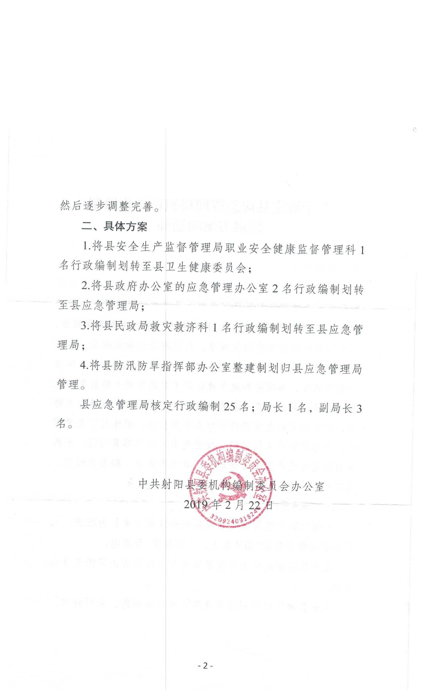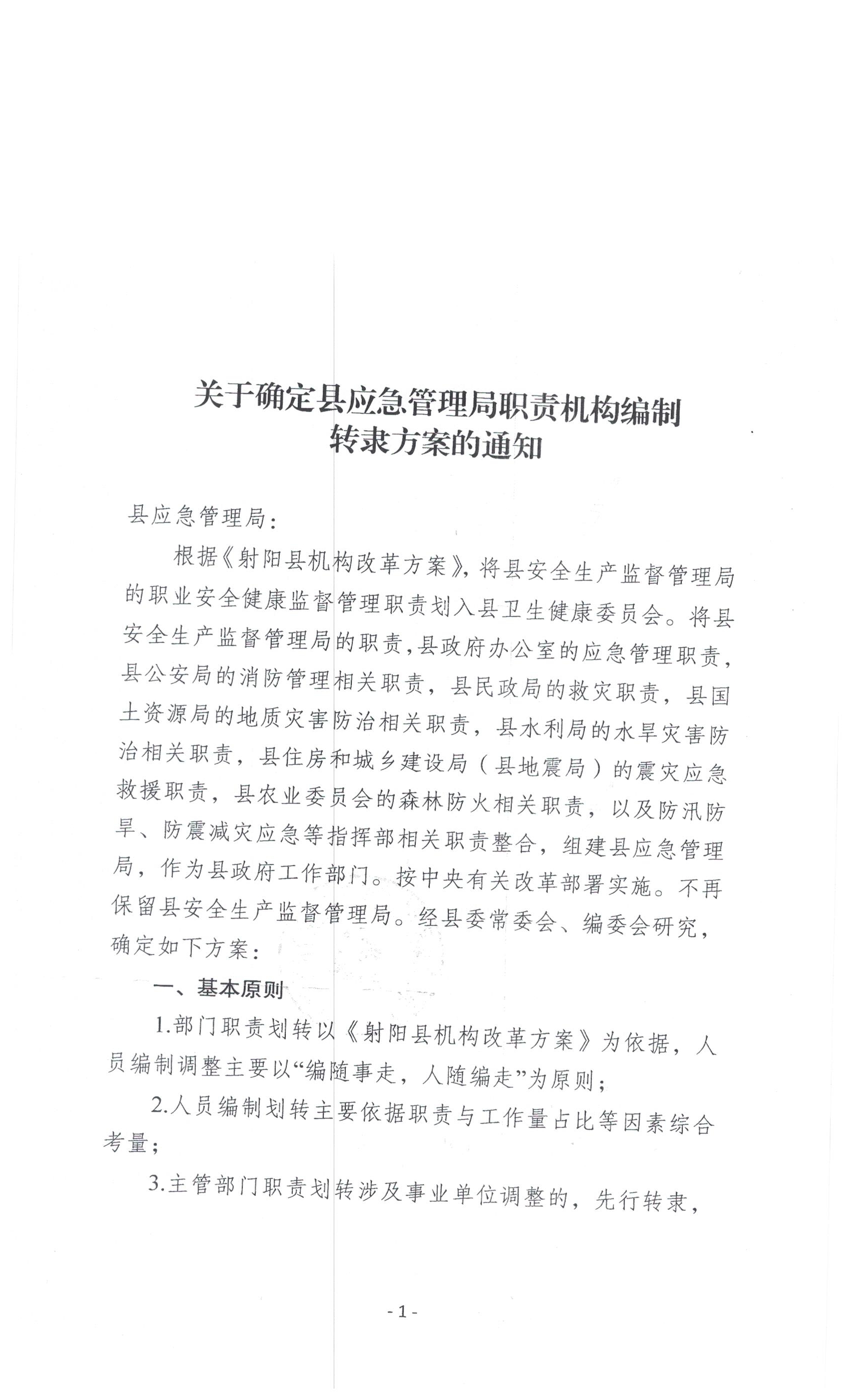 关于确定县应急管理局职责机构编制转隶方案的通知