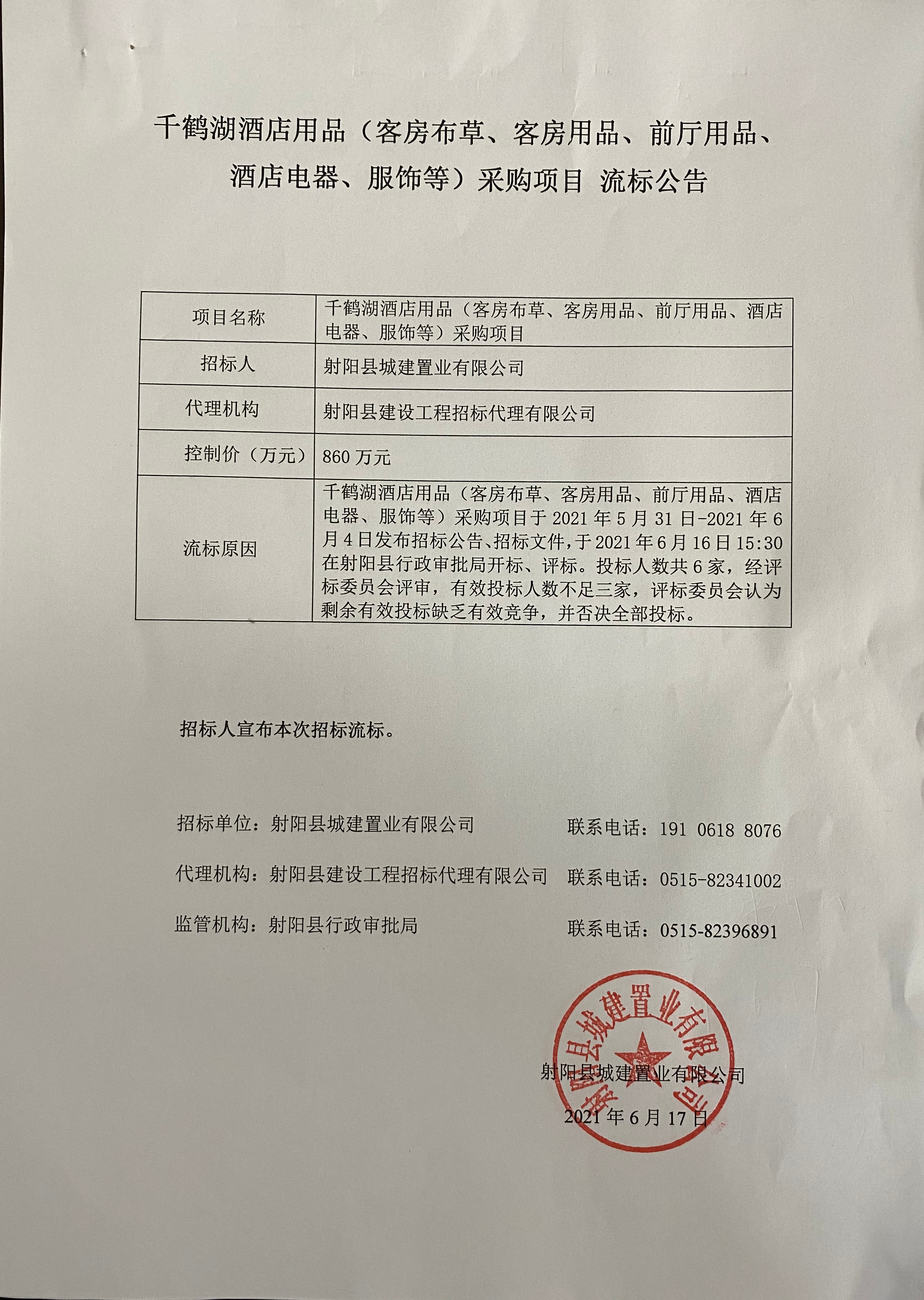 千鹤湖酒店用品(客房布草、客房用品、前厅用品、酒店电器、服饰等)采购项目流标公告