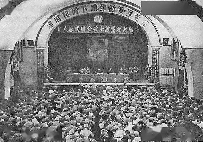 在抗日战争即将取得胜利的前夜,1945年4月23日至6月11日,中国共产党第七次全国代表大会在延安召开。出席七大的代表共755名,其中正式代表547名,候补代表208名,代表全党121万党员,分为中直(包括军直系统)、西北、晋绥、晋察冀、晋冀鲁豫、山东、华中和大后方8个代表团。在七大代表中,年龄最大的近70岁,最小的才20岁左右。
