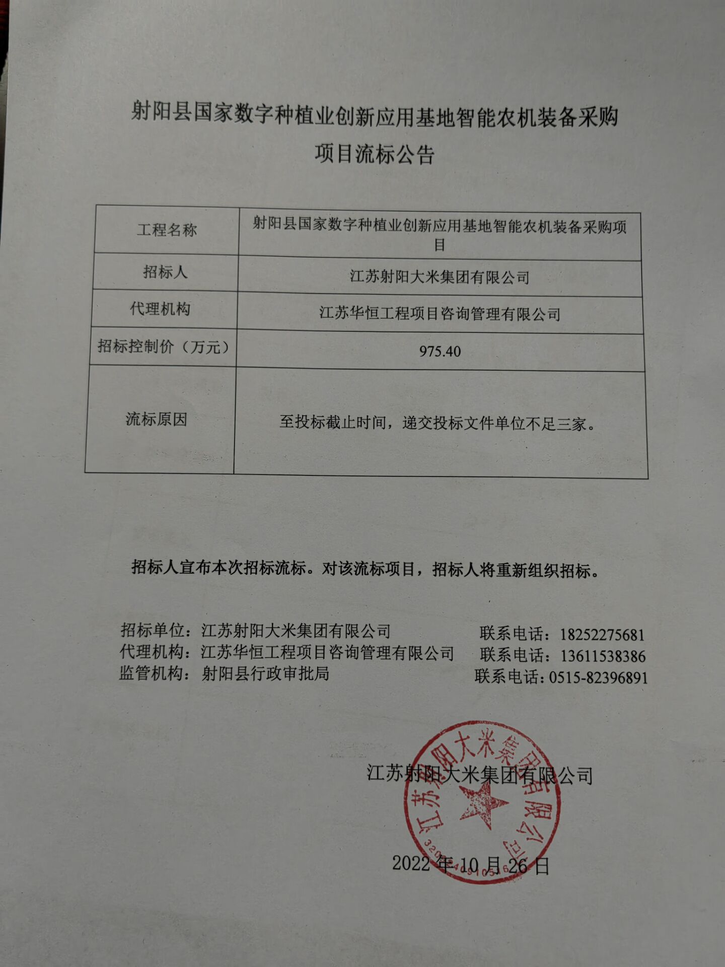 射阳县国家数字种植业创新应用基地智能农机装备采购项目流标公告