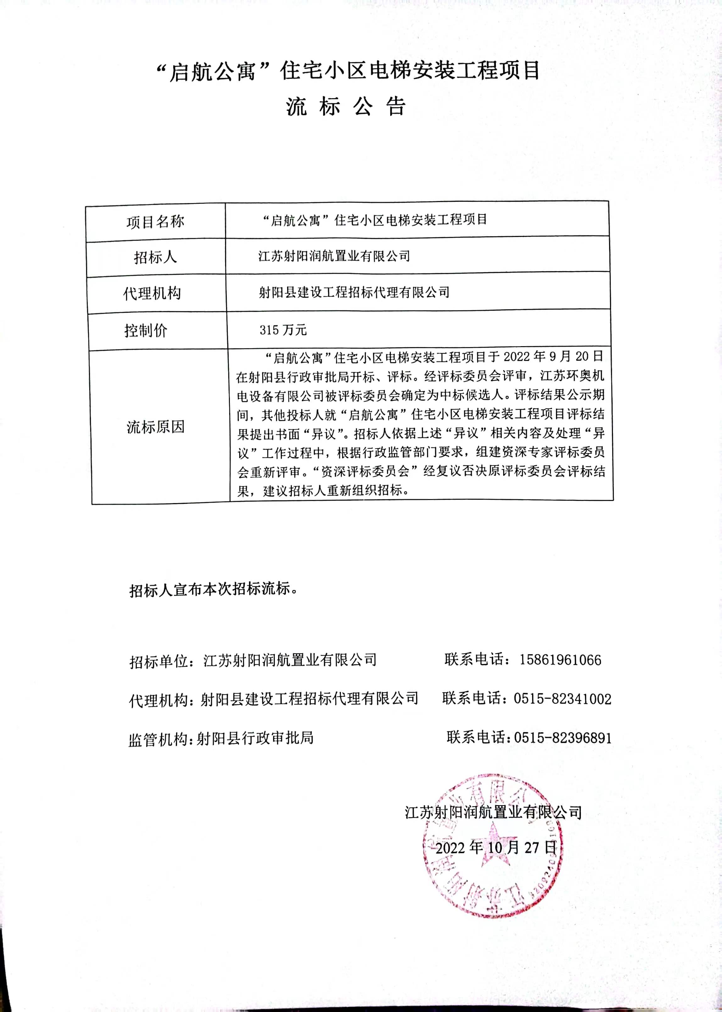 “启航公寓”住宅小区电梯安装工程项目流标公告