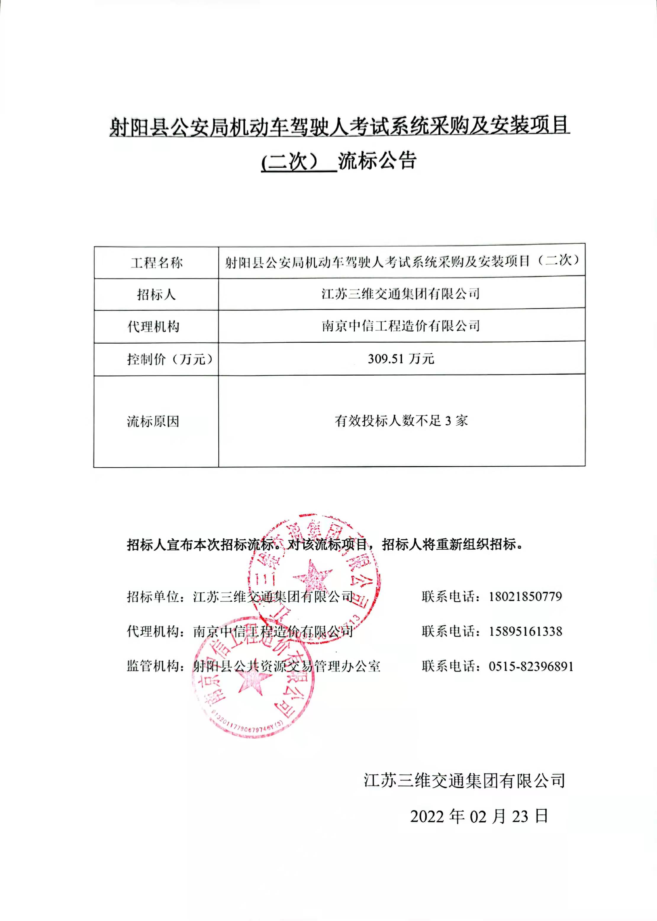 射阳县公安局机动车驾驶人考试系统采购及安装项目(二次)流标公告