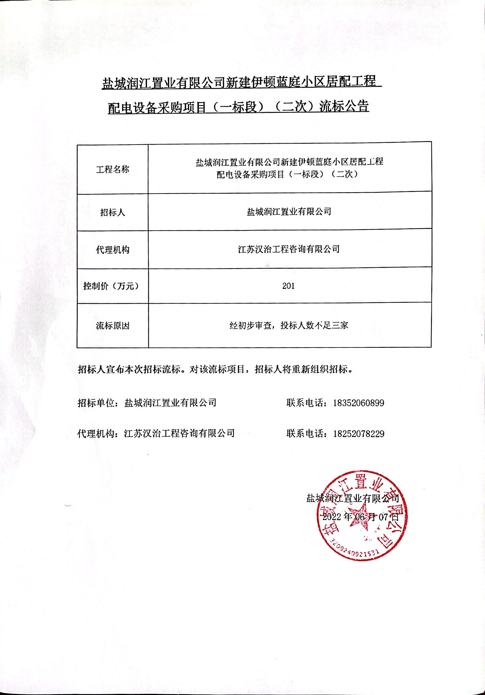 盐城润江置业有限公司新建伊顿蓝庭小区居配工程配电设备采购项目(一标段)(二次)