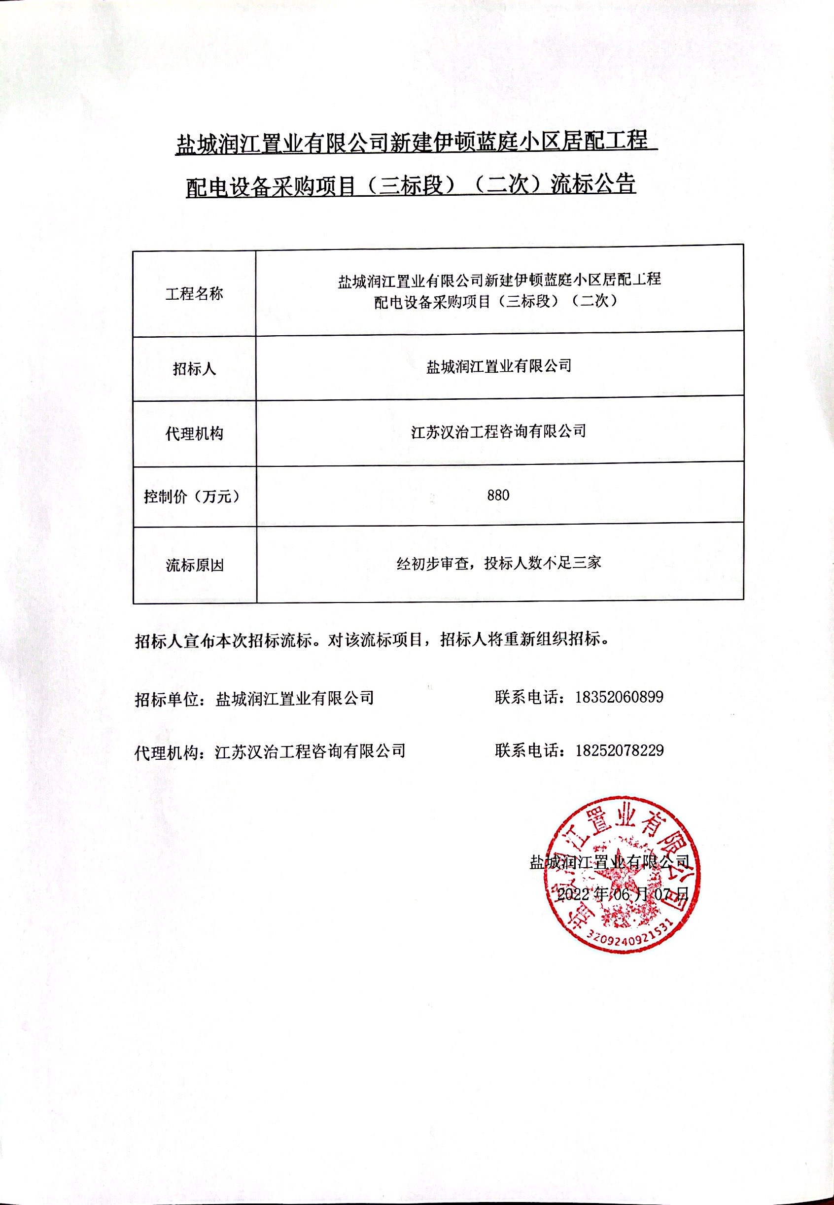 盐城润江置业有限公司新建伊顿蓝庭小区居配工程配电设备采购项目(三标段)(二次)