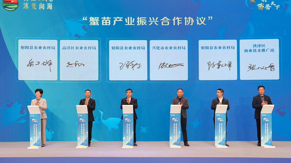 活动中,万荣、李清、赵兴武、吴冈玉等上台启动开幕仪式。上海海洋大学科技处副处长李云凯、盐城市科技局四级调研员李树伟为盐城海纳中华绒螯蟹种业与生态繁育研究院揭牌。与会嘉宾共同观看《蟹逅射阳 苗誉天下》宣传片,体验蟹苗“挂笼”盛况。现场还举行“科技合作协议”“蟹苗销售服务合作协议”“交流合作协议”“海洋生物产业链项目”签约仪式。