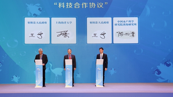 万荣在致辞中表示,射阳得天独厚的滩涂、气候条件使其成为我国重要的河蟹育苗产业化区域、中国蟹苗之乡。近年来,射阳不断叫响“天下渔场、鲜活射阳”名片,农业质效和竞争力不断增强,河蟹育苗产业不断取得新的发展。上海海洋大学是一所以水产、海洋、食品为显著特色的国家“双一流”建设高校,在河蟹生态育苗产业发展方面与射阳企业保持了紧密的合作关系。上海海洋大学愿以本次活动为平台,以双方战略合作协议签约为契机,充分发挥科技、人才优势,对接射阳河蟹育苗产业发展规划,为促进河蟹生态育苗降本增效、品质提升,构建基于育繁推一体化的优良苗种和繁育技术体系,打造高品质河蟹生态育苗的射阳样板做出应有的贡献。