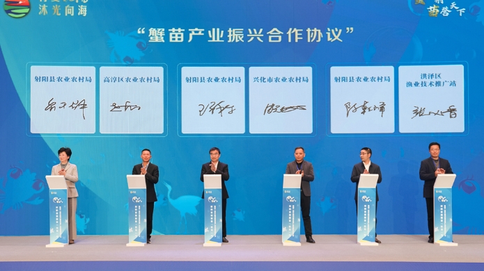吴冈玉在致辞中说,近年来,我县把做强水产种苗产业作为发展向海农业的先导性、基础性工程,蟹苗产业已成为射阳农业的一张标志性名片。我县将以今天活动作为新起点,放大全国绿色种养循环农业试点县、沿海渔业经济示范带建设的牵引效应,深入实施科技强农、质量强农、品牌富农工程,围绕“小蟹苗”做好“大文章”,锚定种养规模化、加工集群化、科技集成化、营销品牌化方向,进一步深化与上海海洋大学等高校院所之间的产学研合作,大力发展海水育苗和新品种试验示范,高水平建设国家级现代水产种业园区,全力打造人海和谐、共生共赢的“蓝色粮仓”,为促进海洋渔业经济高质量发展提供强劲支撑。