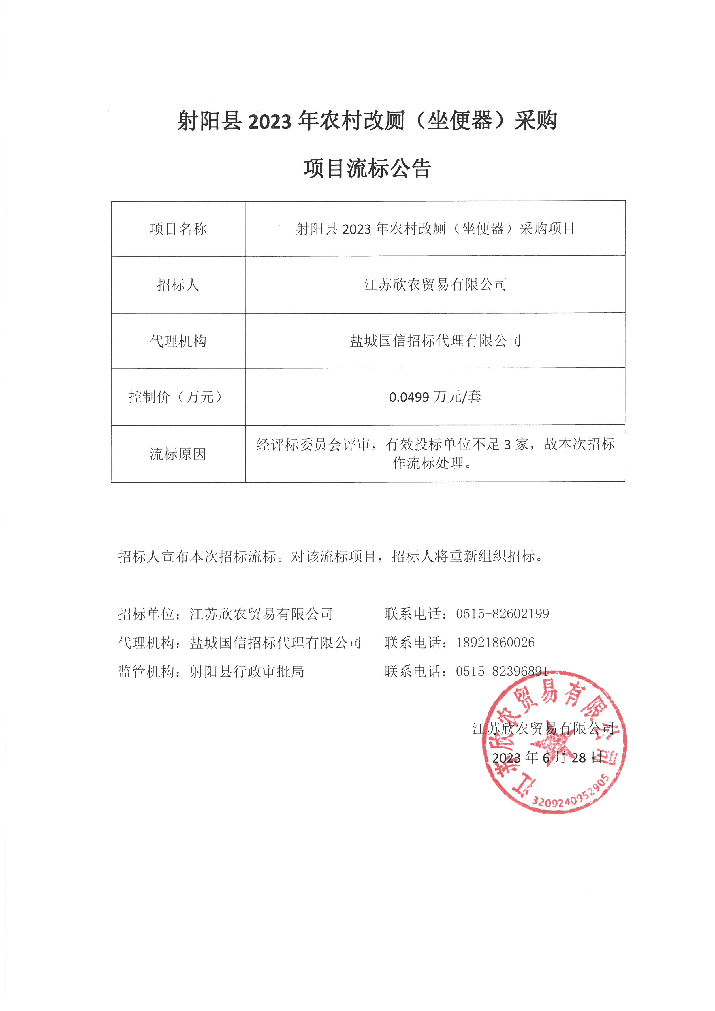 射阳县2023年农村改厕(坐便器)采购项目流标公告