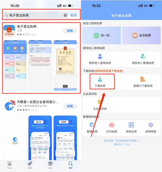 在各手机应用市场搜索“电子营业执照”,成功安装APP后,即可下载使用“电子营业执照”。
