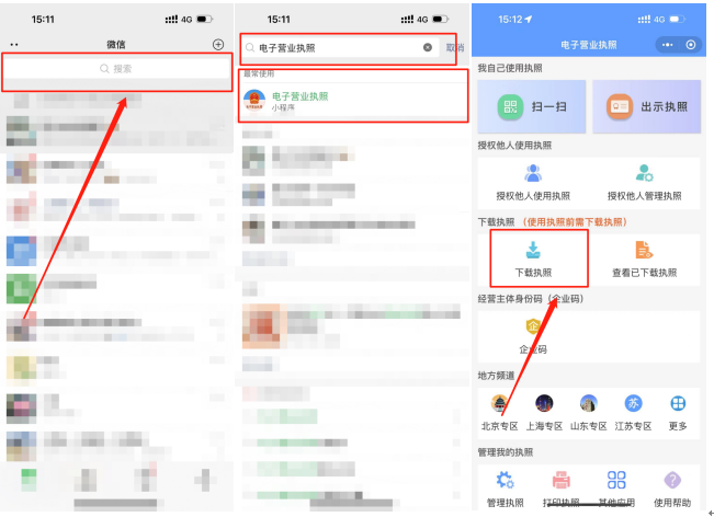 在微信中搜索“电子营业执照”微信小程序。安装步骤: