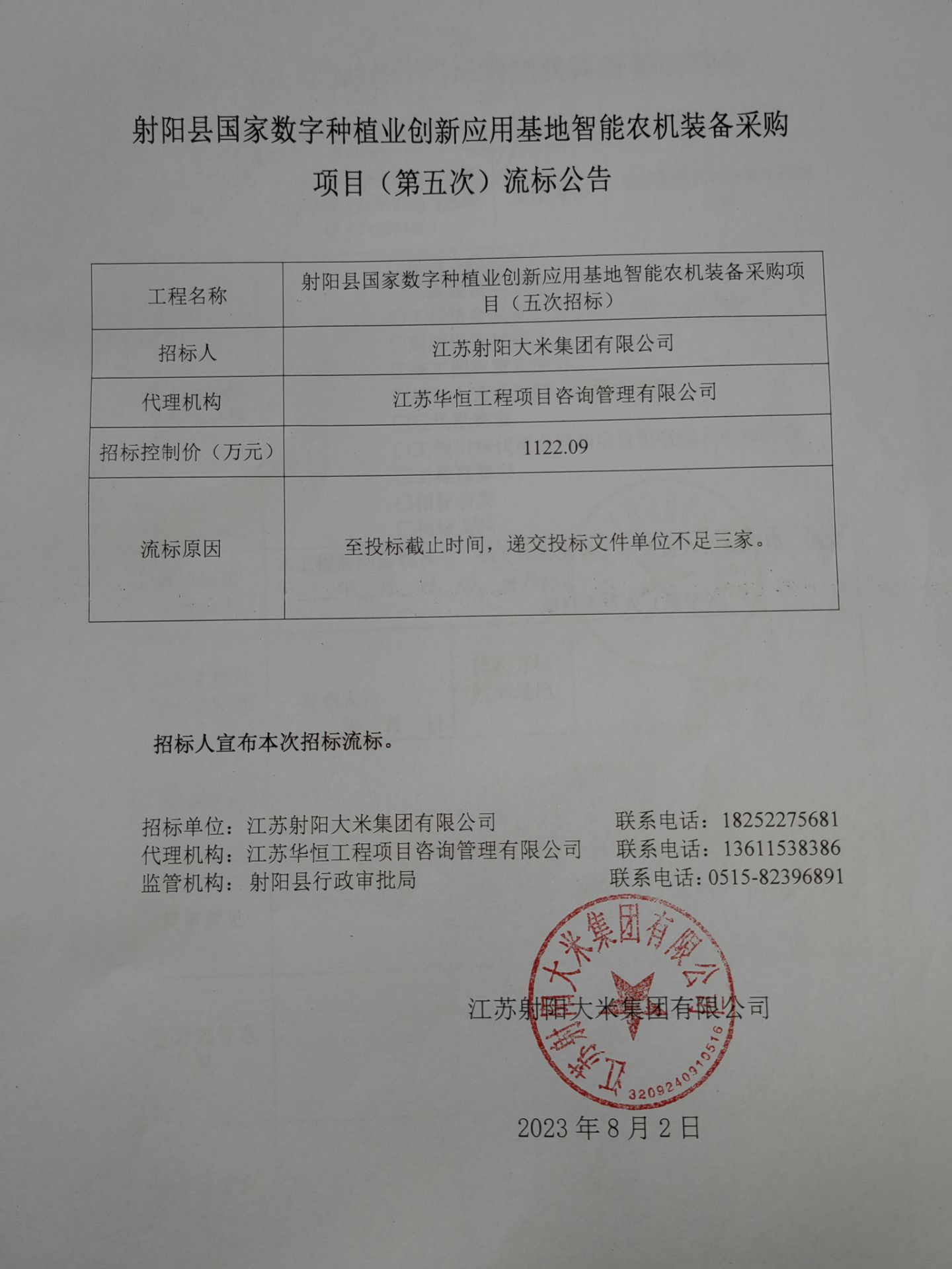 射阳县国家数字种植业创新应用基地智能农机装备采购项目(第五次)流标公告