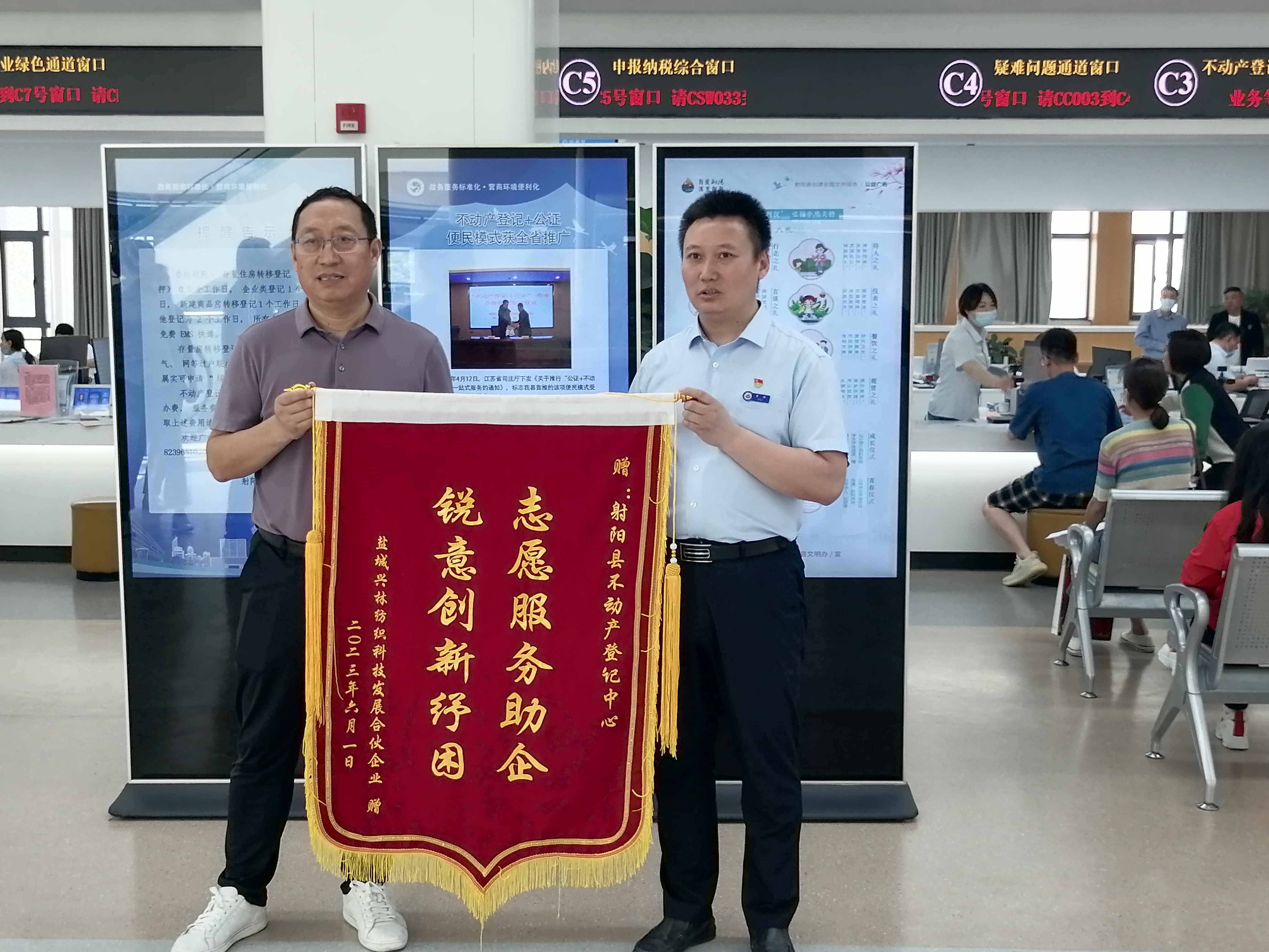 盐城兴林纺织科技发展合伙企业此前办理的一本不动产权证书抵押贷款额度较低,资金问题成为企业扩大再发展的瓶颈,为解决当前急需的资金困难,企业试图通过带着抵押权对企业按幢进行变更登记,拓展不动产灵活融资渠道。这一想法得到了不动产登记中心的全力支持,他们立即安排“苏小登”志愿者进行专窗专人专题服务,详细告知办理分幢层所需要的申请材料,同时开辟“绿色通道”服务机制,第一时间帮助该企业办理了不动产分幢层登记,并将办理好的证件于活动日期间送到企业门上。当企业执行副总裁何勇收到解决他们燃眉之急的证件时,激动不已,专程将一面写有“志愿服务助企 锐意创新纾困”字样的锦旗送到不动产登记窗口,表达对不动产登记中心工作人员快速帮助办理不动产分幢层登记的谢意。