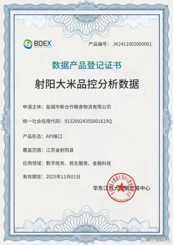 近日,在射阳县数据局的指导下,射阳国投集团下属企业盐城新合作粮食物流有限公司“射阳大米品控分析”数据资产成功在华东江苏大数据交易中心挂牌登记,成为射阳县首张“数据产品登记证书”,这标志着射阳县数据产品交易领域迈出了“从无到有”的关键一步。