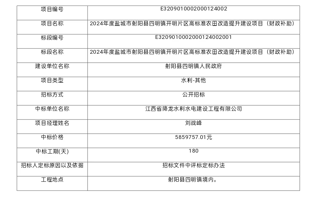 2024年度盐城市射阳县四明镇开明片区高标准农田改造提升建设项目(财政补助)中标结果公告
