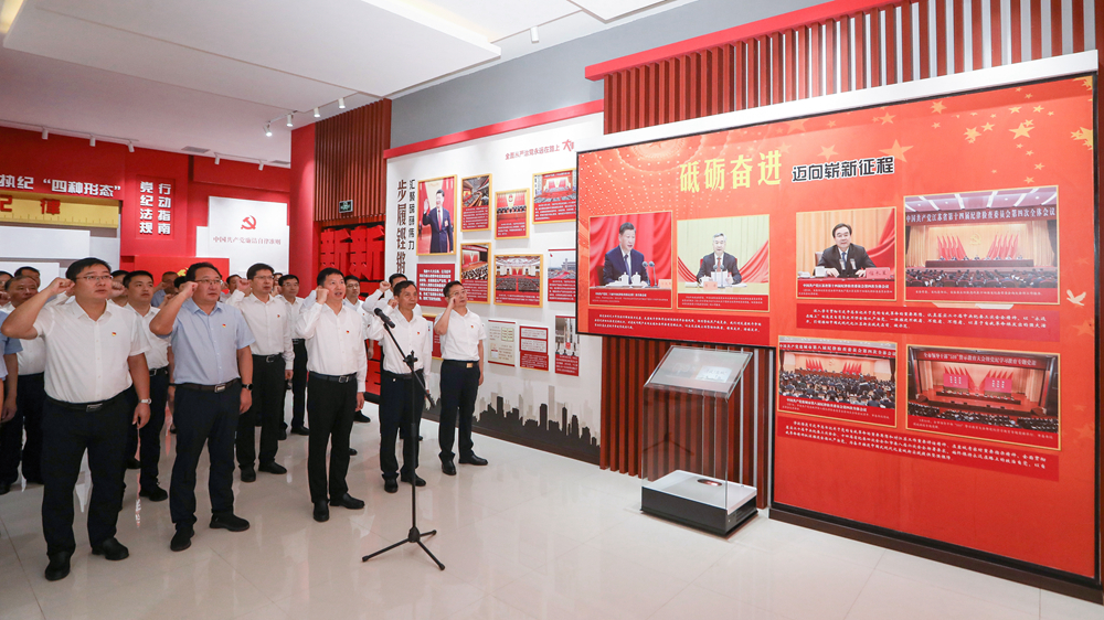 在尚德昭廉教育馆内,县委中心组成员边走边看,认真听取讲解员介绍,驻足仔细观看照片和视频展示,回顾我党成立以来党风廉政建设工作历程,详细了解党和国家领导人关于从严治党的论述,表示要扎实开展党纪学习教育,严守纪律规矩,推动全面从严治党向纵深发展。在馆内宣誓区,全体党员干部重温了入党誓词。