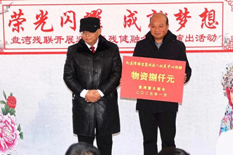 1月10日下午,市董大鑫辰超市有限公司党支部书记、董事长,我县盘湾供销合作有限公司经理董永宏,来到盘湾镇宜康残疾人托养服务中心,在为30多位残疾人朋友捐赠价值8000多元物资(牛奶、苹果、饼干、八宝粥等)爱心慰问品的同时还送去新春的祝福。当该镇残联理事长王中楼代表残疾人在台上接受董永宏捐赠牌时,台下顿时响起阵阵热烈的掌声。
